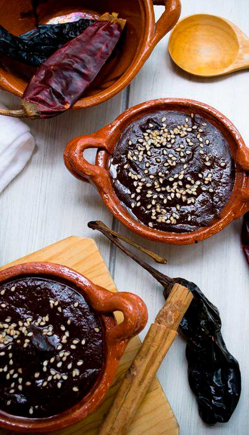 Tres flautas de pollo deshebrado bañadas en mole madre tipo poblano, acompañadas de bombones de mole negro tipo Oaxaca, cebolla deshidratada, ajonjolí tostado y negro, plátano macho y un toque de hilo de chile.